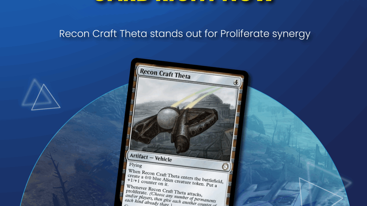 Recon Craft Theta is especially popular for Counter Intelligence, where it synergizes perfectly with new cards like Inspirit, Flagship Vessel and Kilo, Apogee Mind. Thanks to a surge in Proliferate mechanics returning in a big way, this card is rapidly climbing in demand.