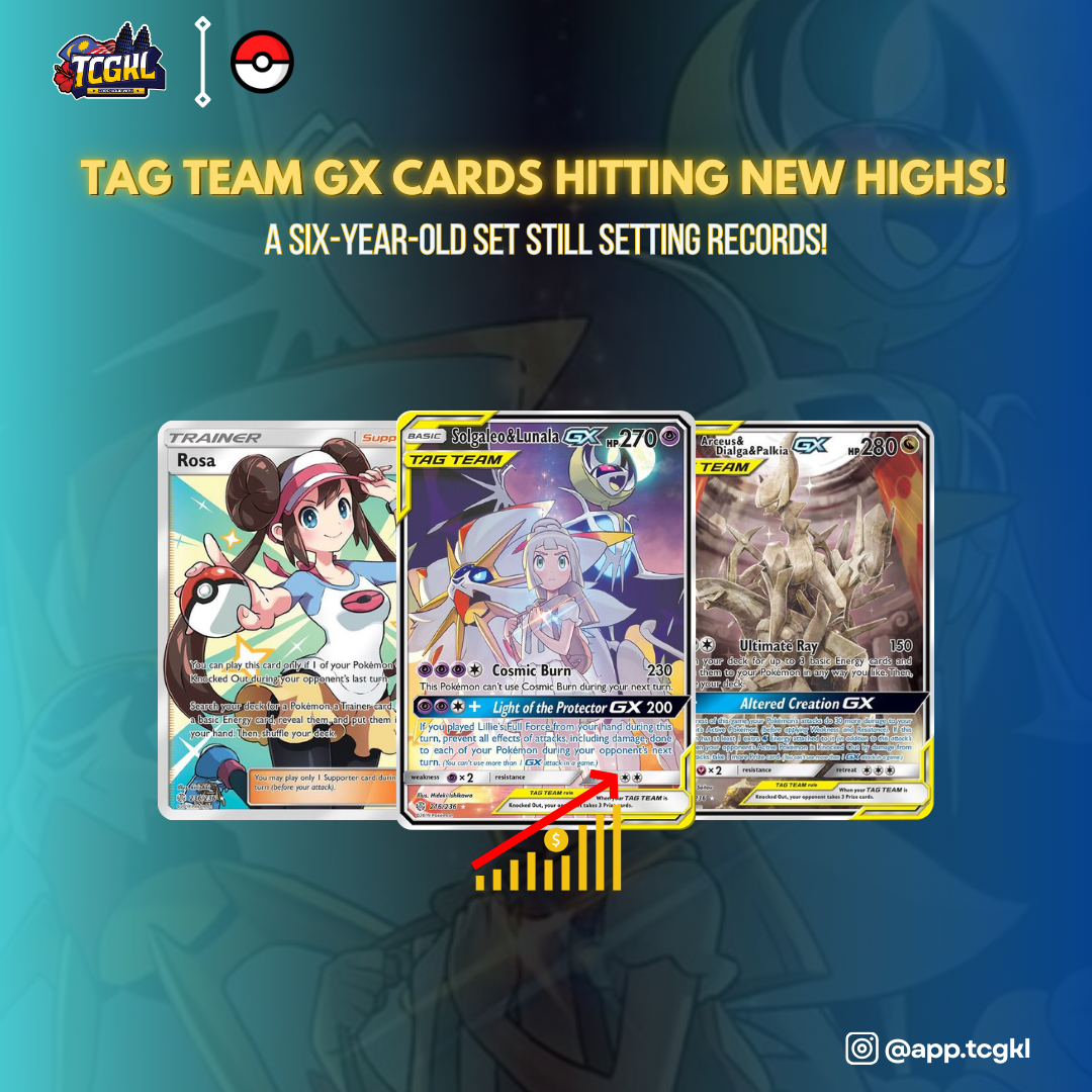 Solgaleo & Lunala-GX from Cosmic Eclipse has skyrocketed from $125 to $203, making it one of the set’s most valuable Tag Team cards! And it’s not alone—Rosa 236, the set’s most expensive card, has hit a new all-time high at $240, while Arceus & Dialga & Palkia-GX is now sitting at $215 after a steady climb.