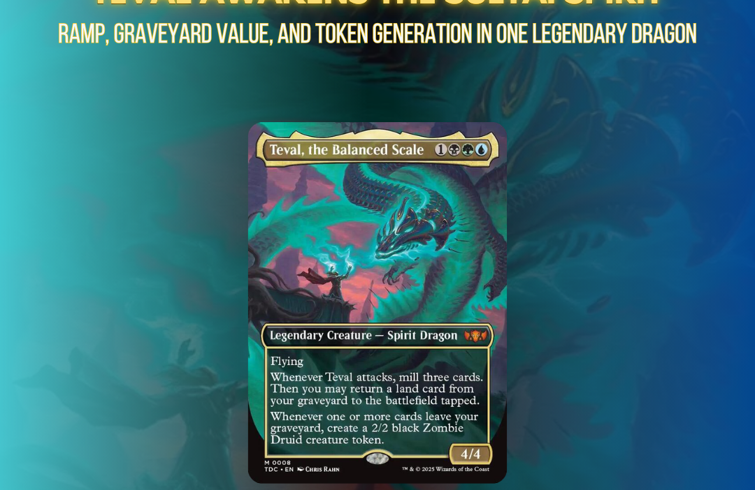 While you could lean into zombies, the real power lies in landfall and graveyard loops. Teval is a game-changer from the Tarkir: Dragonstorm Commander Precons — and a must-watch for anyone brewing in Sultai colors.