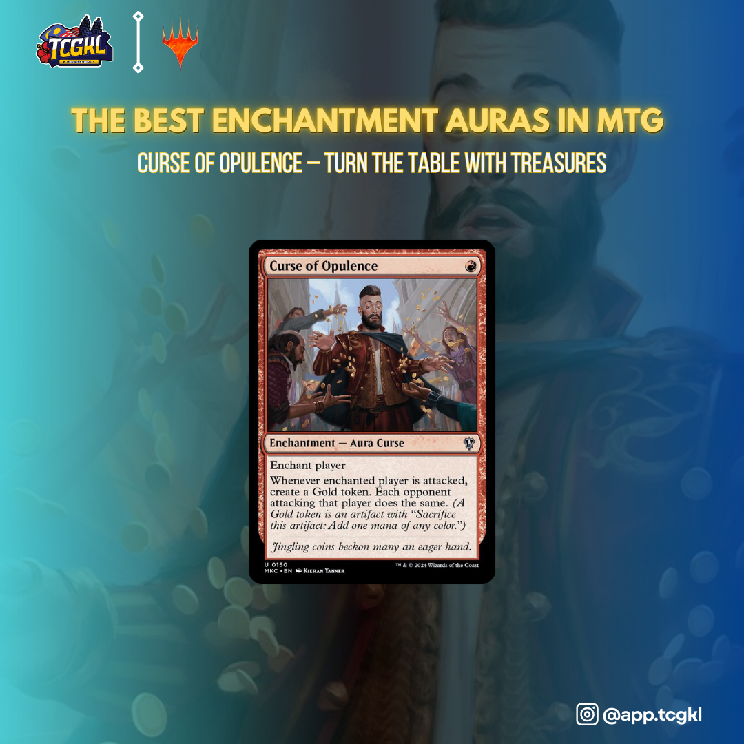 Curse of Opulence is a one-mana red Aura Curse from Commander: Murders at Karlov Manor, and it’s an absolute game-changer. Enchant an opponent, and whenever they’re attacked, both you and the attacker create a Gold token.